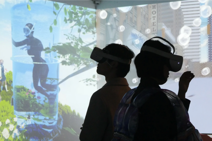 Breathing Space features 7 kinds of virtual characters. The characters are familiar beings with maximized characteristics; for example: ‘Snail’ covered with armor to defend its soft body, ‘Vending Machine’, a hikikomori that selectively converses with others, ‘Plastic Bag’ a pure being whom anyone can clearly see through. The audience will wear the Oculus and pre-programmed wearable devices and become the on-screen characters. Each character begins invading the other’s space and will organically change based on their designed tendencies. The space for each character will expand or shrink as if one’s taking a breath. There will also be dangerous situations where the room will fill up with water up to the character’s face.